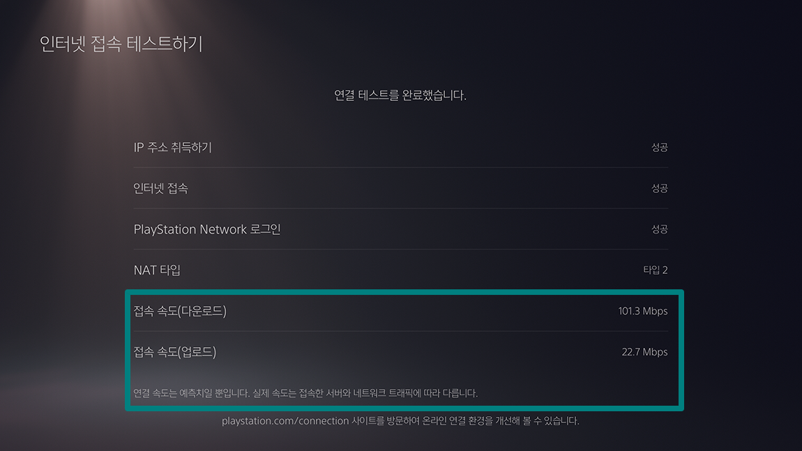 PS5 설정→네트워크→접속상태→인터넷 접속 테스트하기 메뉴를 이용해 PS5에 연결된 인터넷의 속도를 테스트해 보실 수 있으니 PS5 인터넷 연결을 완료하셨다면 한 번쯤 확인해 보시면 좋을 듯합니다.