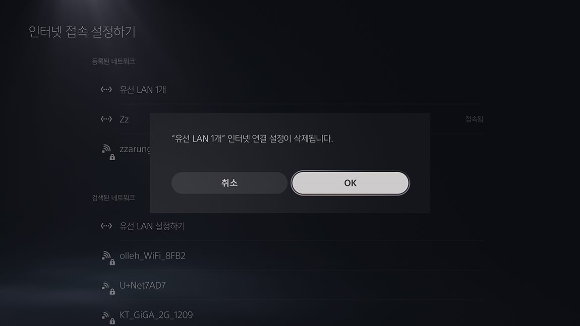 위와 같이 접속 과정을 진행하시면 PS5 유선 인터넷 접속 설정은 완료되며 삭제가 필요한 경우는 등록된 네트워크 목록에서 X 버튼을 눌러 선택하셔서 기존 연결 설정 삭제도 가능합니다. 저는 예전에 이미 네트워크 연결을 등록해 놓았기에 글을 작성하기 위해 새롭게 연결한 네트워크는 삭제했습니다.