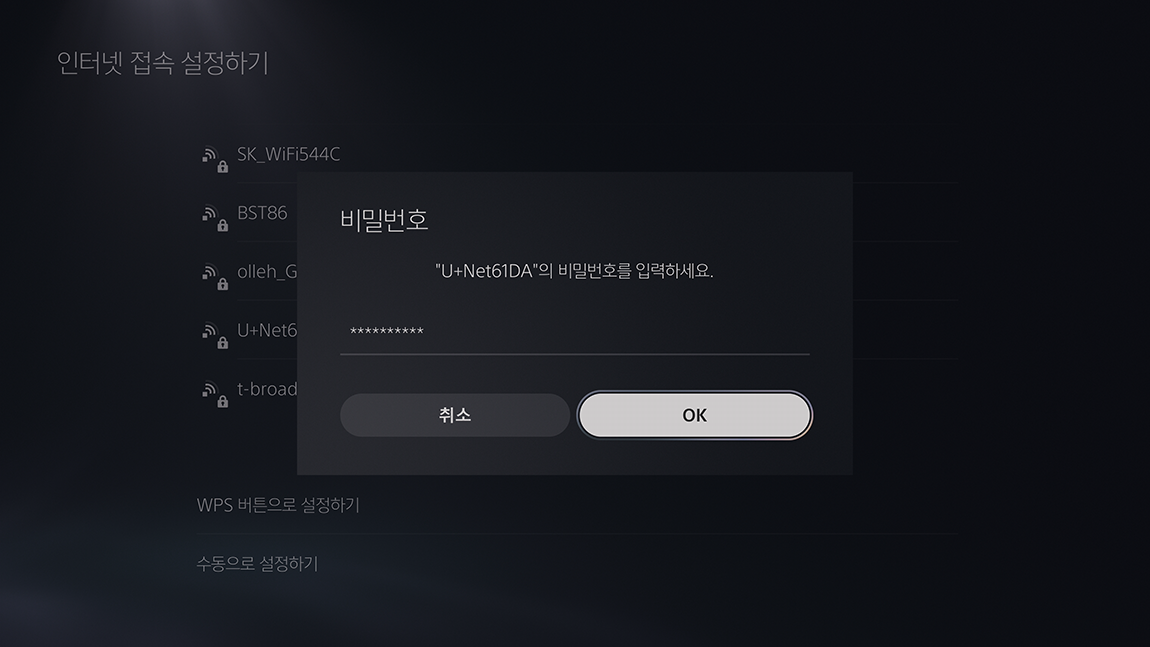 선택한 무선 와이파이 비밀번호를 입력하시고 OK 버튼을 선택하시면 무선 연결은 완료됩니다.