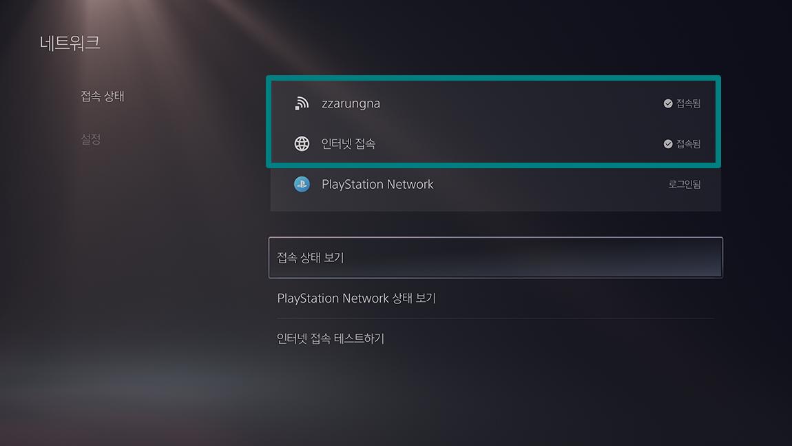 PS5 기기에서 무선방식과 유선 방식으로 모두 연결하셨다면 PS5 기기에 아래 이미지와 같이 유선과 무선 연결이 모두 접속됨으로 표시됩니다.