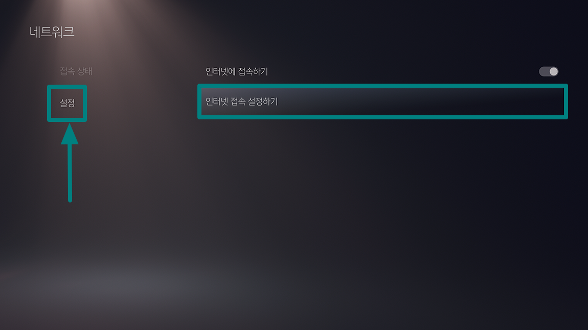 왼쪽 설정 메뉴 선택 후 인터넷 접속 설정하기 메뉴를 선택하시면 됩니다. 만약 메뉴가 안 보이신다면 인터넷에 접속하기 메뉴를 활성화하시면 인터넷 접속 설정하기 메뉴가 표시됩니다.