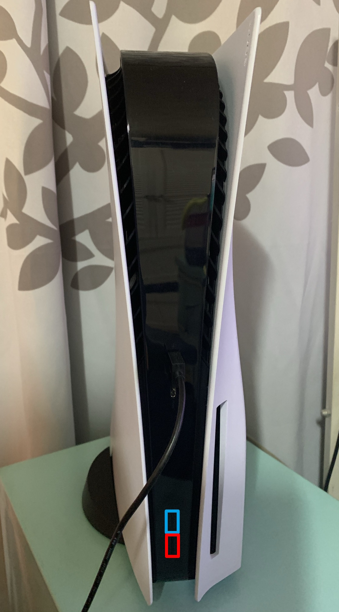모든 케이블 연결이 완료되었다면 세로로 세운 PS5 기기 기준으로 전원 버튼과 CD를 뺄 수 있는 버튼이 앞면에 있습니다.