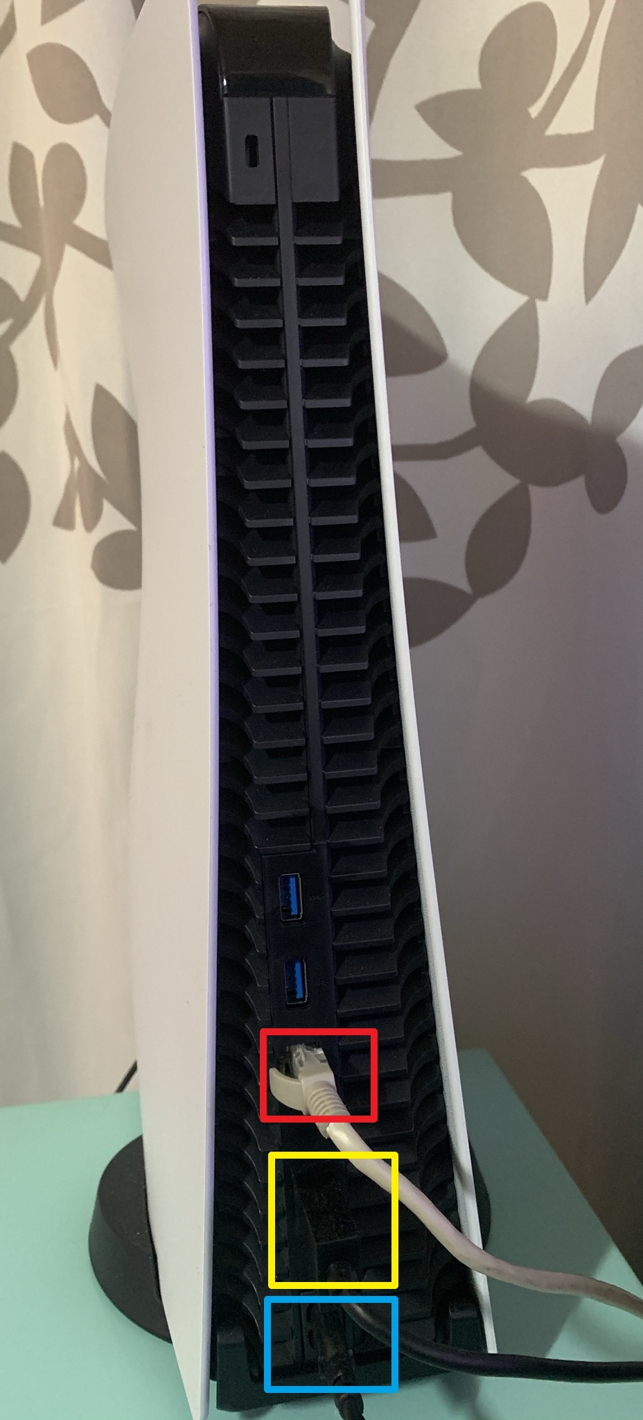 PS5 기기를 세로로 세운 상태에서 뒷면에 인터넷 랜선, 파워 케이블 연결, 전원 케이블 연결이 가능합니다. 뒷면을 보니 USB 3.0 추가로 연결 가능한 슬롯이 두 개나 더 있는 게 눈에 띕니다.