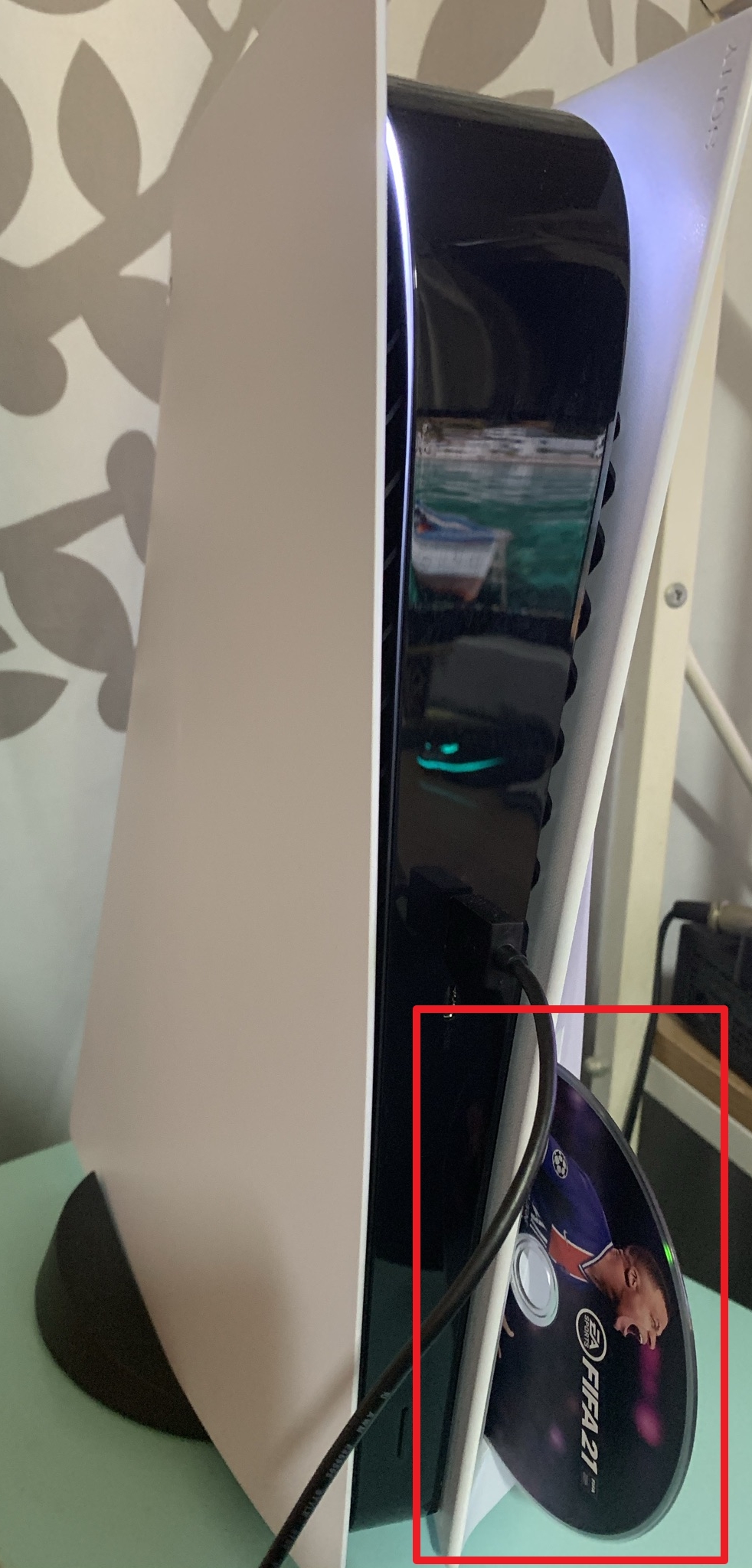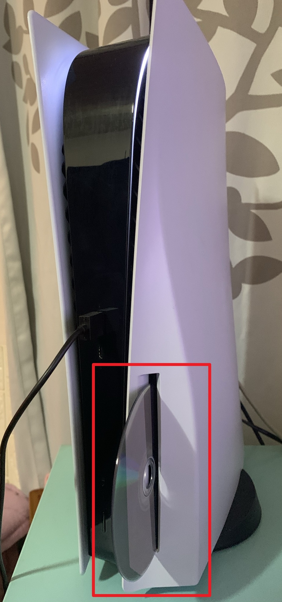 PS5 기기를 세운 상태에서 CD를 삽입할 땐 아래 이미지와 같이 삽입하셔야 정상적으로 인식이 됩니다. 기본적인 상식과는 반대로 CD를 삽입해야 하다 보니 처음엔 조금 당황스러웠습니다.