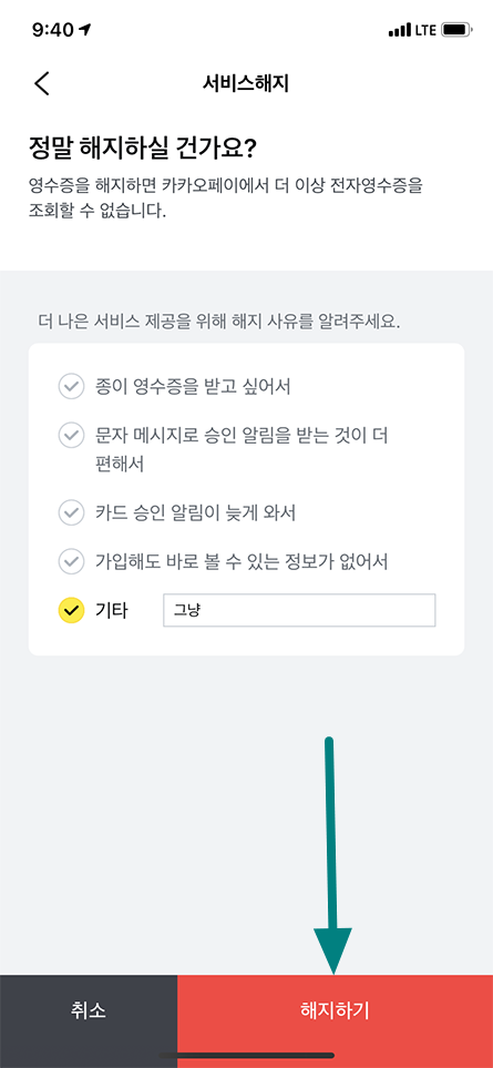 영수증 서비스를 해지하시겠습니까? 알람 화면에서 해지 메뉴 선택.