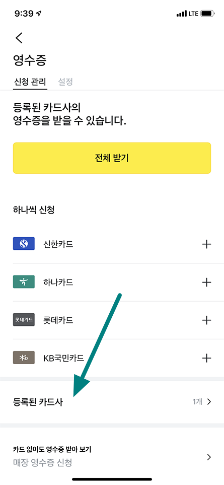 영수증 → 설정 메뉴 → 영수증 가입 및 해지 메뉴 선택.