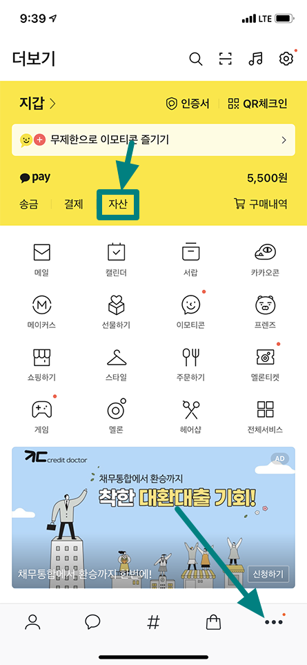 하단 메뉴 중 ㆍㆍㆍ 메뉴를 선택하신 후 자산 메뉴를 선택하시면 됩니다.