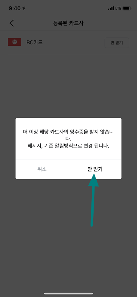 영수증 서비스를 해지하시겠습니까? 알람 화면에서 해지 메뉴 선택.