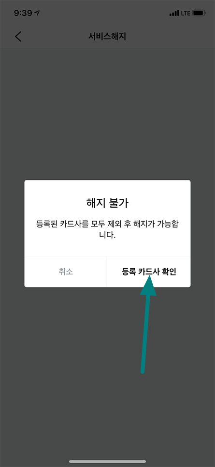 해지 불가 알림이 나오게 되는데 등록 카드사 확인 선택.