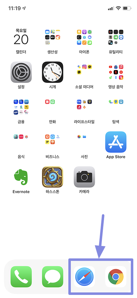 제가 아이폰에서 주로 사용하는 브라우저는 사파리, 크롬 브라우저인데 두 가지다 사용 방법은 같습니다. 작성 기준은 사파리 브라우저 기준으로 작성하였으며 사파리 브라우저를 실행하시면 됩니다.