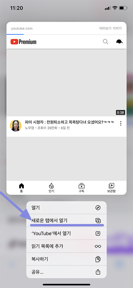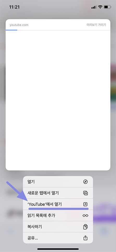 다시 유튜브 링크를 선택 하실 때 손으로 터치하고 계시면 추가 메뉴가 나오게 됩니다.