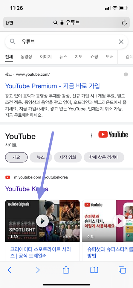 간단히 브라우저를 이용해 검색 사이트에서 검색된 결과에 유튜브 동영상 링크를 눌러 봤습니다.