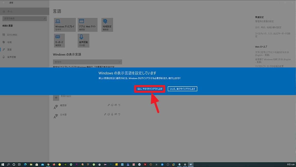 그럼 윈도우 언어를 변경하시겠습니까? 메뉴가 나오며 はい(네)를 선택해 주시면 PC 재부팅 이후 윈도우 10에서 표시되는 글자가 일본어에서 한글로 변경되게 됩니다.