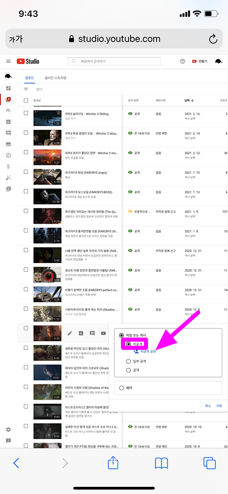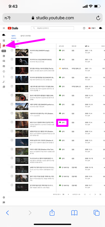 그럼 PC 환경과 동일한 구성으로 유튜브 스튜디오 페이지 확인이 가능하며 왼쪽 메뉴에서 콘텐츠 메뉴를 선택하시면 기존에 업로드한 유튜브 동영상 목록이 나옵니다. 이곳에서 원하는 사람에게만 보여줄 동영상 오른쪽에 표시된 공개 버튼을 누르시면 됩니다.