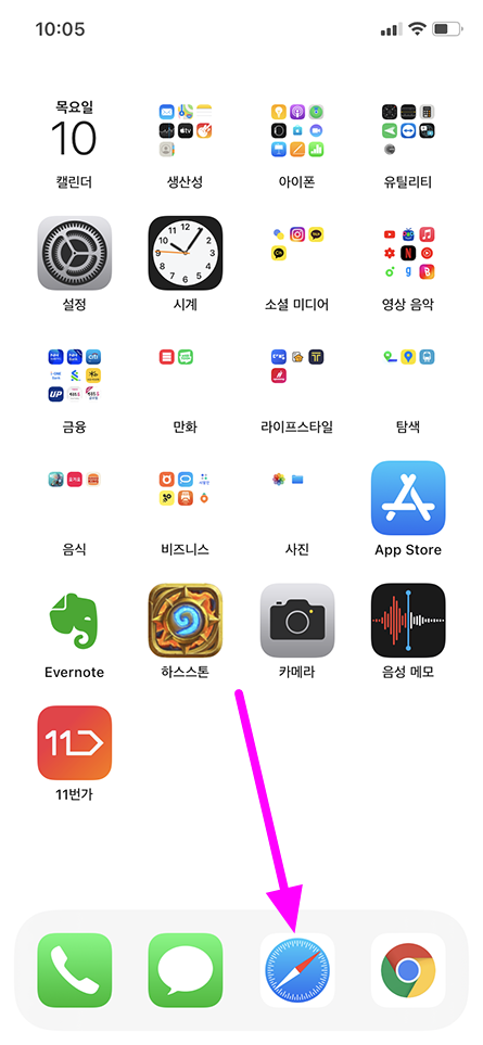 아이폰 앱 목록 중 사파리 브라우저 실행.
