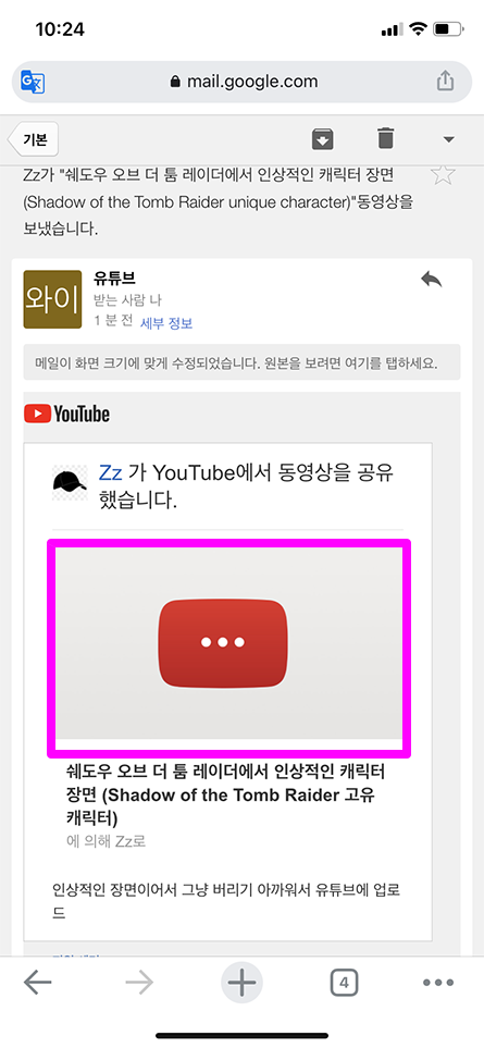 다시 제 보조 구글 계정으로 들어가 보니 아래 이미지와 같이 동영상 공유 메일이 와있습니다. 해당 유튜브 동영상 링크를 클릭하시면 다른 사람에게 비공개이지만 저만 볼 수 있는 유튜브 동영상이 생겼습니다.