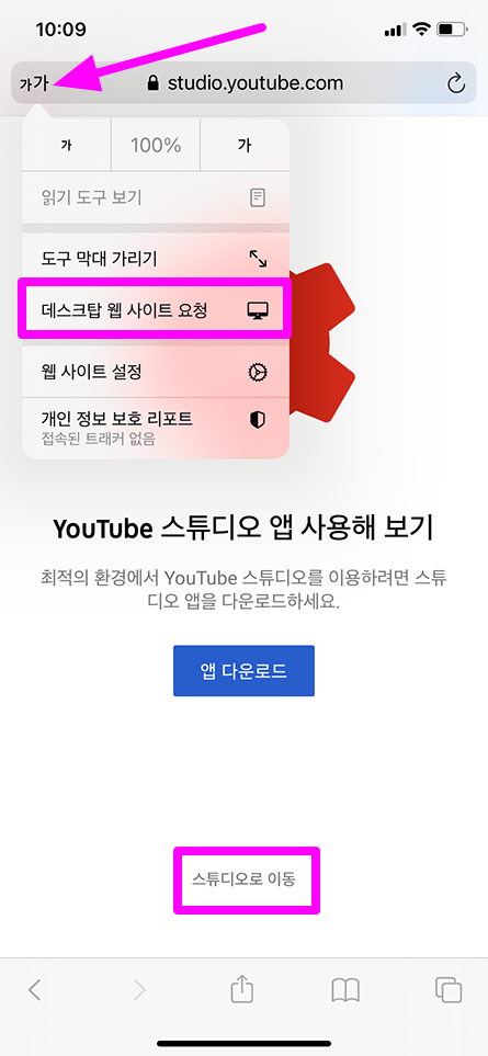 구글 계정이 로그인되어 있는 상태에서 https://studio.youtube.com/ 링크 접속 후 스튜디오로 이동 버튼을 누르시거나 사파리 브라우저 상단 왼쪽에 있는 부분을 누르시고 데스크탑 웹 사이트 요청을 선택하시면 됩니다.