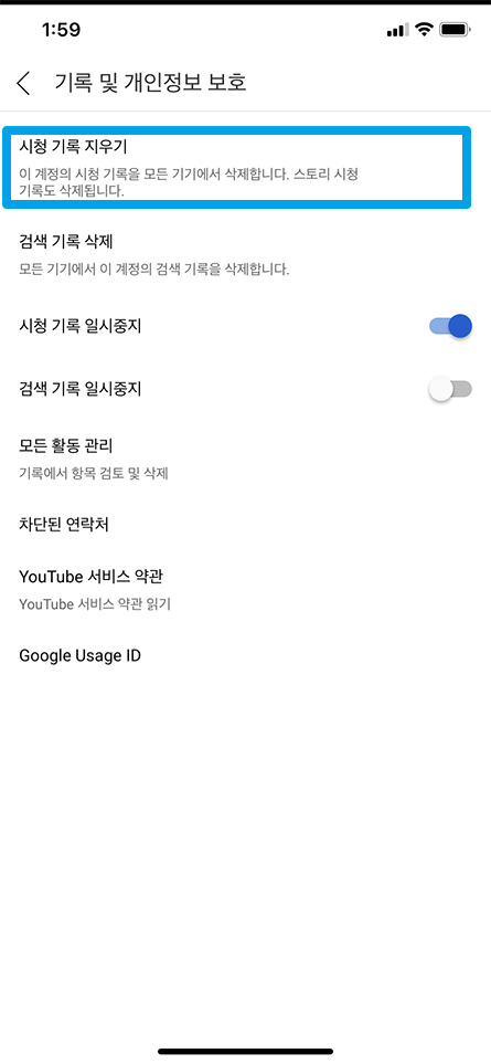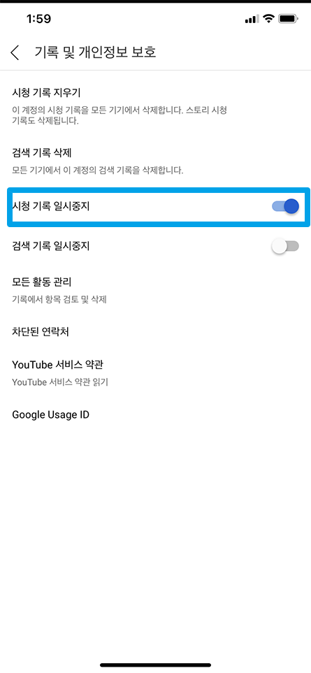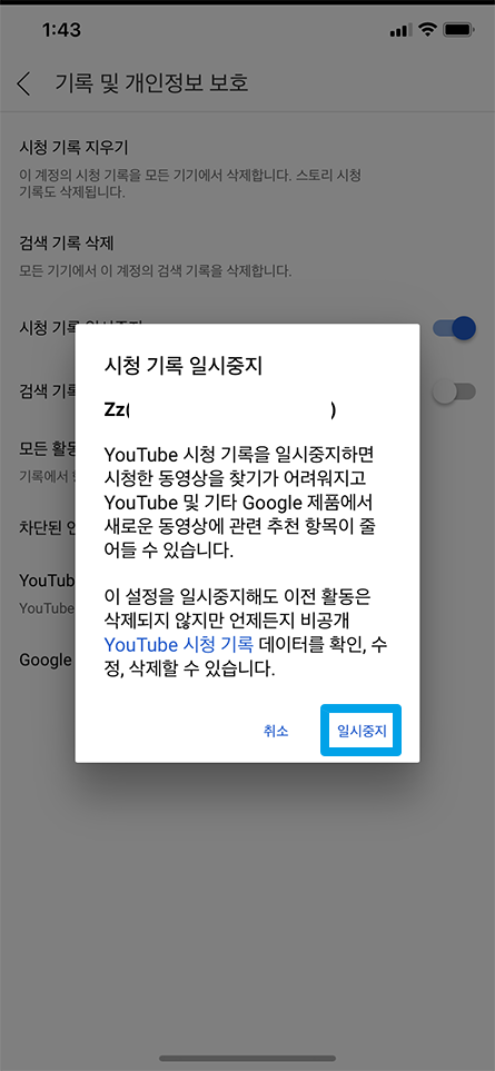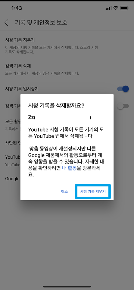 저의 경우는 시청 기록이 남아있어 시청 기록 일시 중지를 했음에도 동영상이 이어서 재생되었기에 시청 기록까지 삭제하고 사용했습니다.