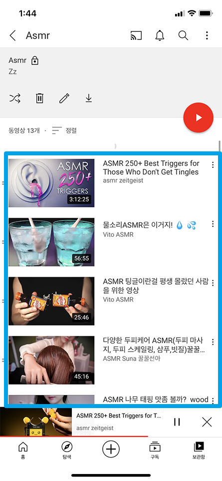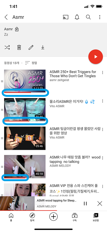 유튜브 재생목록을 관리하고 활용한 방법에 대해서는 이전에 작성한 글이 있으니 필요하신 분들은 참고하시면 좋을 듯합니다. - https://zzarungna.com/1383 제가 추가했던 ASMR 재생목록을 전체 재생하게 되면 아래 이미지와 같이 동영상 목록에 빨간색 줄이 표시되어 있습니다. 이 빨간색 줄은 이전에 시청했던 영상 기록입니다. 그러다 보니 유튜브 동영상을 재생할 때마다 유튜브 동영상의 이어보기 기능 때문에 처음부터 동영상 재생이 안 되니 좀 불편했습니다.