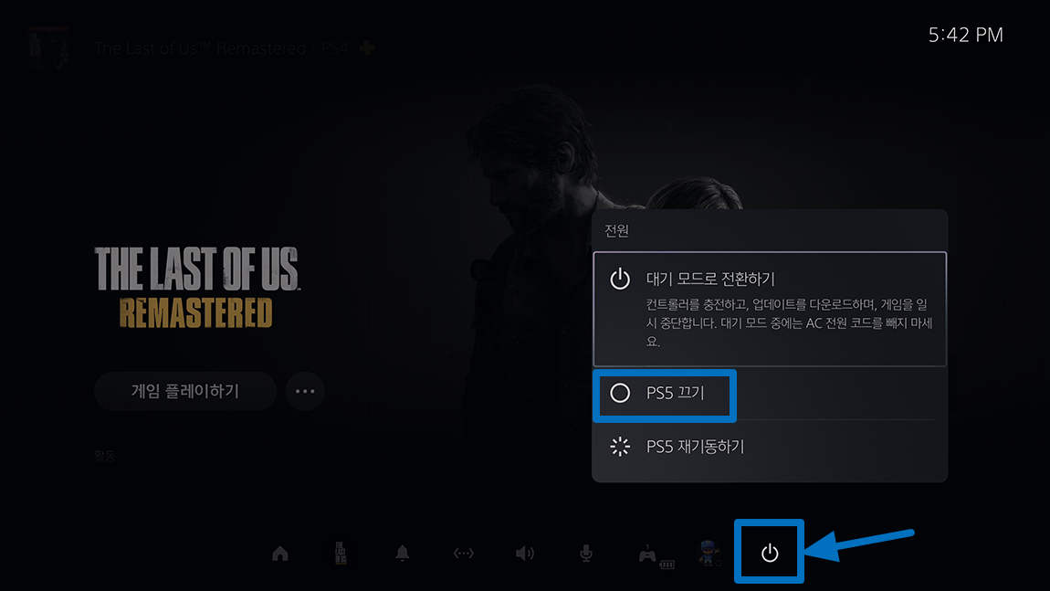 마지막으로 가장 많이 사용하는 전원입니다. PS5 기기를 사용하고 기기의 전원을 끄고 싶을 때 빠른 설정 메뉴에 전원 메뉴를 활용해 PS5 기기를 끄거나 대기 상태로 전환합니다.