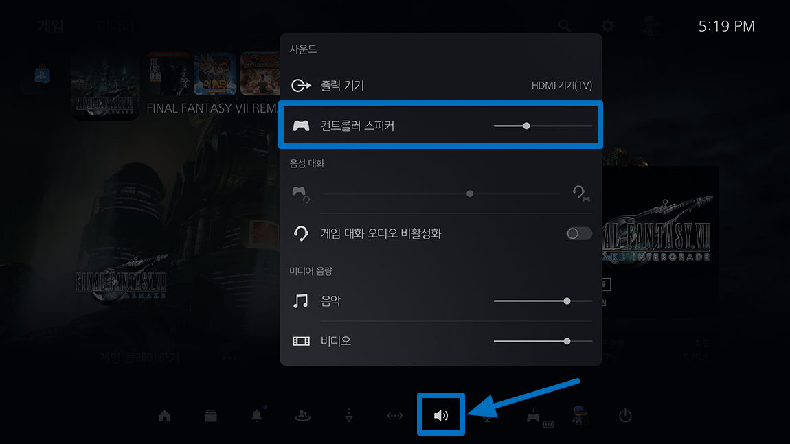 세 번째는 사운드입니다. 대부분 TV를 연결해 사용하니 PS5 자체 사운드를 조절할 일은 많이 없지만, 게임에 따라 무선 컨트롤러에서 소리가 나오는 게임이 있습니다. 새벽에 혼자 게임을 하는데 갑자기 TV에서 나오는 소리가 아닌 컨트롤러에서 큰 사운드가 들려 놀랜 적이 있는데 이럴 때는 컨트롤러에서 나오는 음량 조절을 하실 수 있으니 참고하시면 좋을 것 같습니다. 기본 설정된 컨트롤러 스피커 소리가 꽤 큰 편인 것 같습니다.