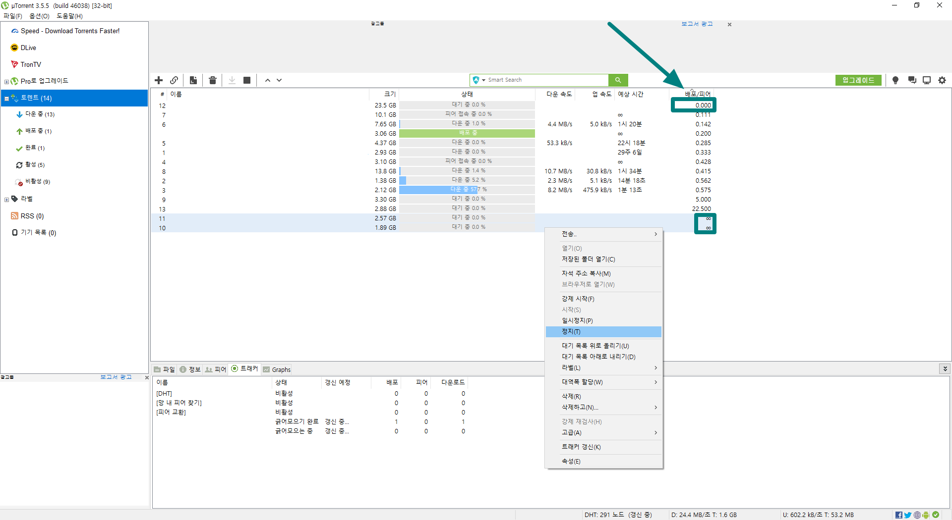 이럴 경우에는 배포/피어 목록을 눌러 정렬을 하신 뒤에 속도가 0.000이거나 ∞(무한대) 표시가 되어 있는 토렌트 파일들을 선택해서 마우스 오른쪽 버튼을 누르시고 정지를 눌러 주시면 속도가 유지되고 있는 토렌트 파일들이 먼저 다운로드받을 수 있으니 좋습니다.