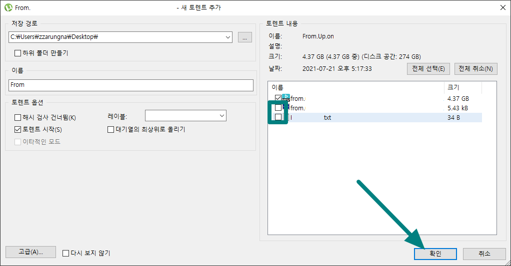 쓸모없는 파일은 굳이 다운로드 항목에 포함 시키지 않으셔도 됩니다. 제가 받은 파일 중 필요한 파일은 동영상 파일만 있으면 되는데 대부분의 토렌트 파일 다운로드 항목에는 필요한 파일 외에 쓸모없는 파일이 포함된 경우가 많습니다. 필요없는 파일을 다운 받지 않으시려면 아래 이미지와 같이 체크를 해제하시고 다운로드를 진행 하시면 필요 없는 파일은 제외하고 필요한 파일만 받을 수 있습니다.