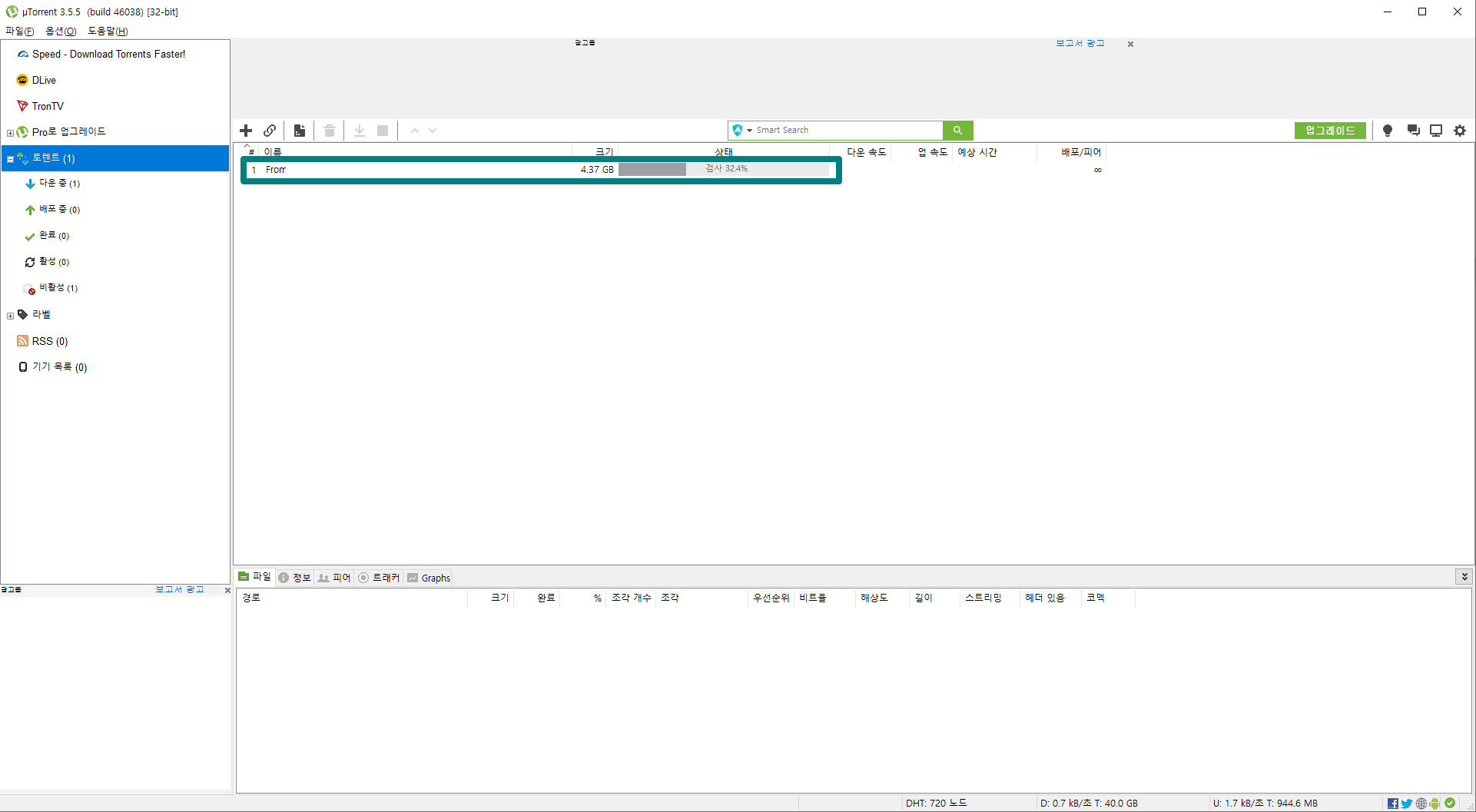 위와 같이 동일한 토렌트 파일 실행 후 다운로드 경로가 같다면 검사가 끝난 후 아래 이미지와 같이 중간에 끊겼던 파일을 이어서 다운로드받으실 수 있습니다.