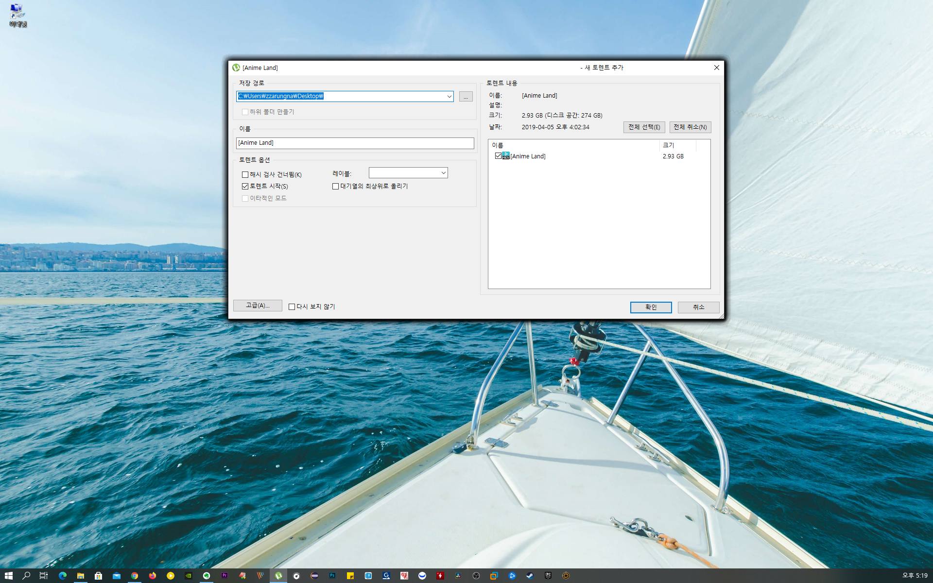 그럼 아래 이미지와 같이 토렌트 프로그램이 실행되게 되며 실행한 토렌트 파일 다운로드 관련 정보가 여러 개 겹쳐져 있는 상태로 표시되게 됩니다. 결국엔 15개의 토렌트 파일을 하나씩 확인 버튼을 눌러야 다운로드가 진행되지만 토렌트 파일을 일괄적으로 실행할 수 있기에 많은 양의 토렌트 파일을 다운로드 받을 때는 하나씩 토렌트 파일을 실행하고 다운로드받는 것보다는 편했습니다.