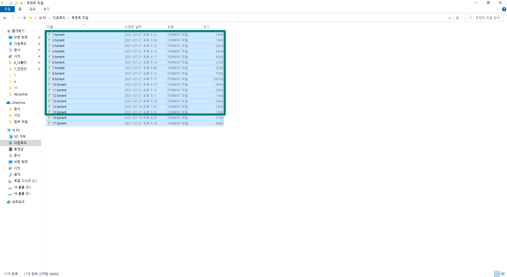 아래 이미지와 같이 토렌트 파일이 여러개인 경우 한번에 실행 가능한 토렌트 파일은 15개까지 입니다. 해당 토렌트 파일을 모두 드래그 한 상태에서 엔터를 누르시면 됩니다. 저는 15개 파일을 드래그하여 선택한 후 엔터를 눌러 실행 하였습니다. 15개 이상 포함한 상태에서 엔터를 누르면 토렌트 프로그램이 실행되지 않으니 참고 하시면 좋을 것 같습니다.