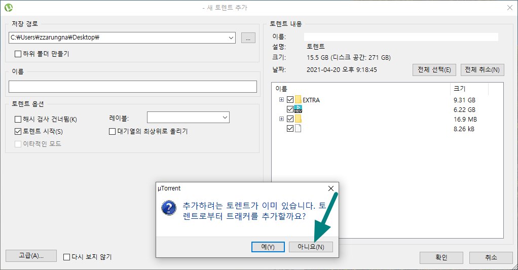 토렌트 파일을 여러 개 관리하며 파일을 다운로드 받다 보면 중복되는 토렌트 파일을 실행하는 때도 있습니다. 이러한 경우도 아래 이미지와 같이 추가하려는 토렌트가 이미 있는 경우는 아니요를 눌러 이미 다운로드 중인 토렌트 파일은 제외하실 수 있습니다.