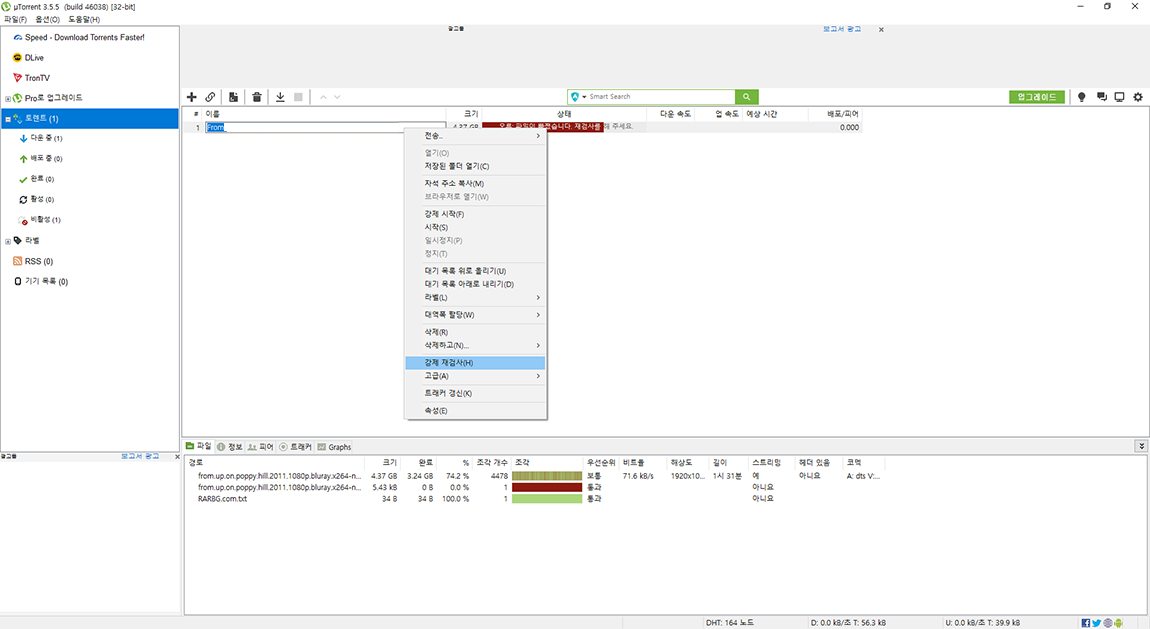 토렌트 다운로드 경로를 수동으로 변경하는 방법ㆍ토렌트 오류 파일이 빠졌습니다. 재검사를 해 주세요.