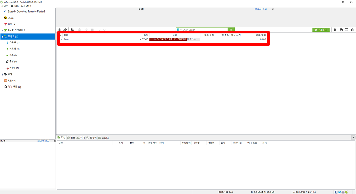 토렌트에서 다운로드 중이었던 파일을 수동으로 다른 경로로 이동한 뒤 토렌트 프로그램을 실행하게 되면 아래 이미지와 같이 오류 파일이 빠졌습니다. 라고 표시됩니다. 당연한 결과입니다. 제가 다운로드중이었던 파일을 수동으로 다른 곳에 옮겼으니 오류가 날수밖에 없습니다.