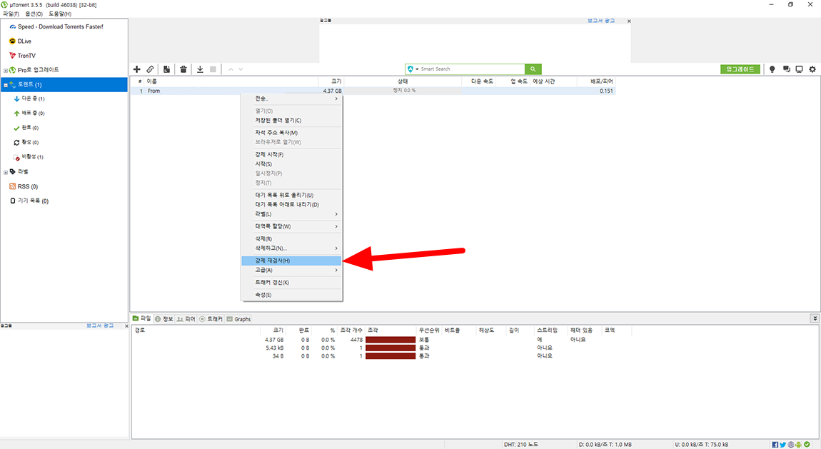그런 뒤 다시 다운로드 중인 파일을 마우스 오른쪽 버튼 선택 후 강제 재검사를 누른 뒤 시작을 누르시면 됩니다.