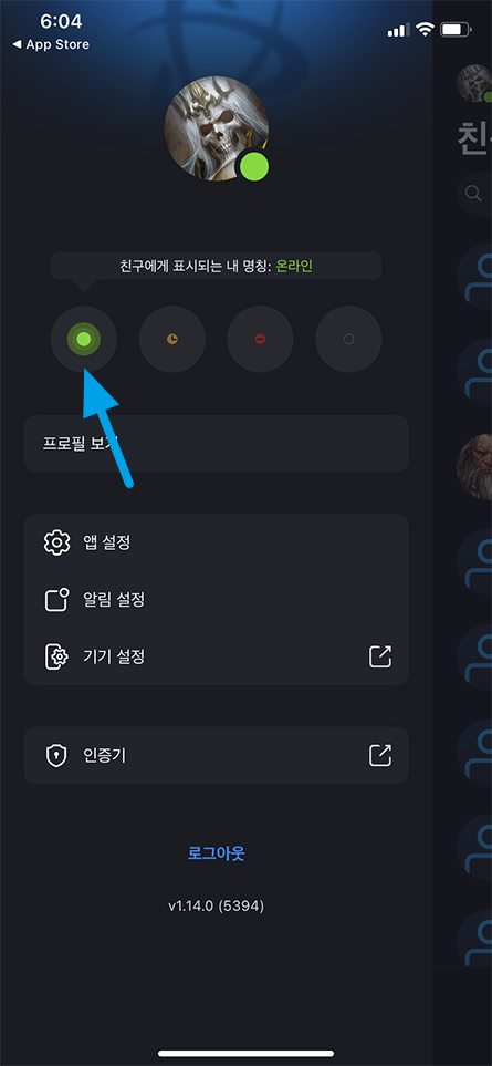 프로필 선택 후 온라인으로 변경해 주시면 됩니다. 만약 이미 온라인이셨다면 다른 용무 중, 오프라인으로 상태는 제외하고 변경해 보시면 좋을 듯합니다.