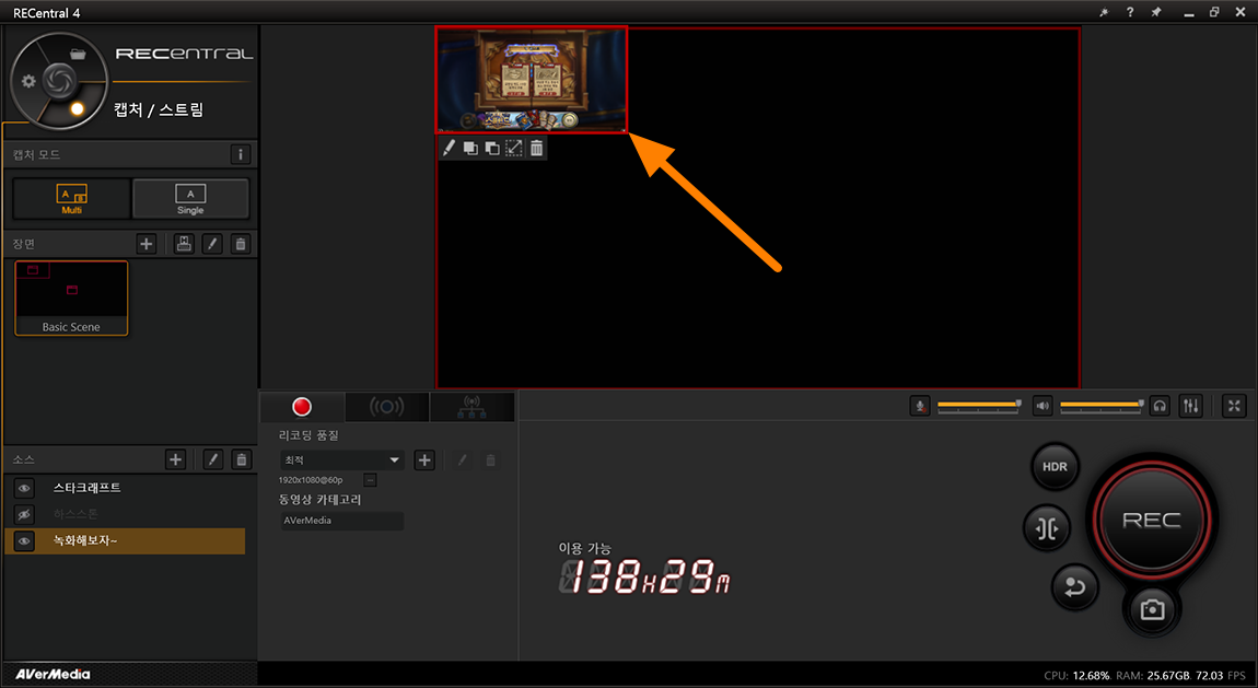 저는 하스스톤 게임을 실행해 캡처를 해보았는데 정상적으로 실행 중인 프로그램을 캡처하게 되면 아래 이미지와 같이 캡처 화면이 표시되게 됩니다. 끝쪽을 선택해서 전체 화면으로 만들어 주시면 됩니다. 화면이 검은색 영역에 모두 채워졌다면 REC 버튼을 눌러 영상을 녹화하시면 됩니다. 개인적으로 HDR이 가능한 4K 모니터를 사용 중인데 HDR 버튼을 누르고 녹화를 하게 되면 화면이 너무 밝아져서 HDR을 활성화하지 않고 사용했습니다.