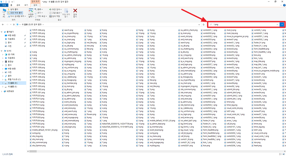 이럴땐 파일만 검색 될수 있도록 처럼 확장자 앞에 별을 붙여 검색 하시게 되면 파일만 검색되니 편합니다. 저는 이미지 파일의 확장자 중 하나인 *.png로 검색해 진행해 보았습니다. 그럼 아래 이미지와 같이 파일만 표시되니 편합니다.