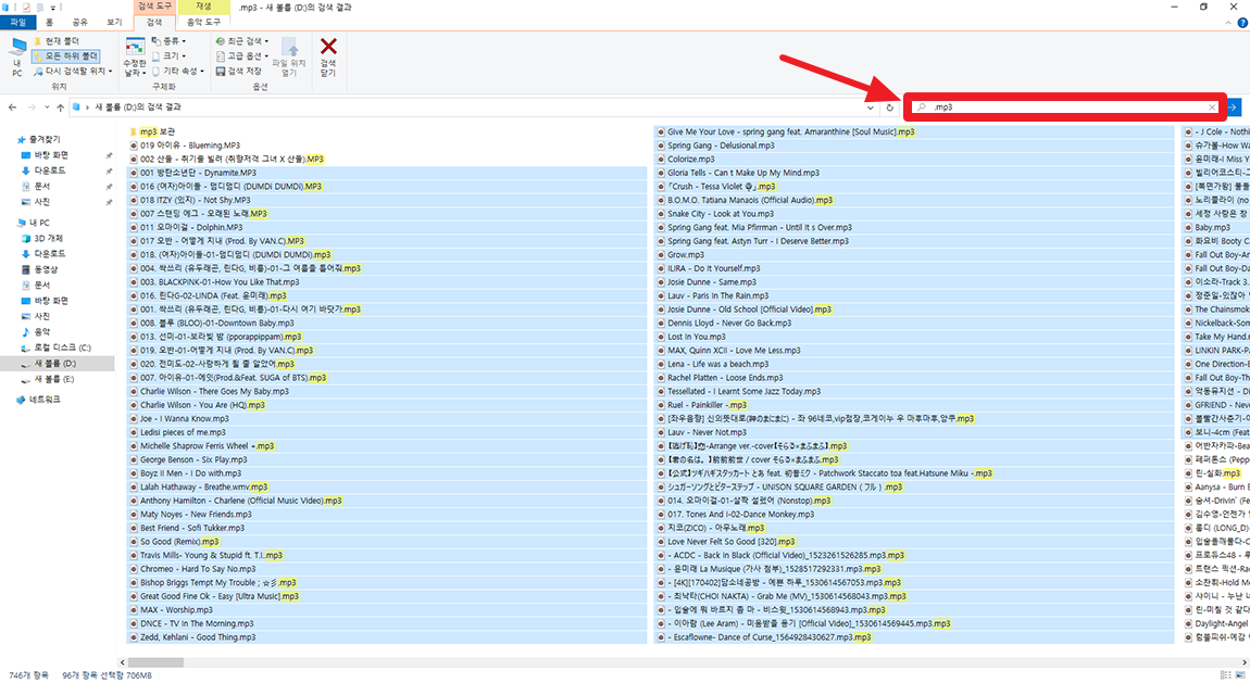 저는 음악 파일의 확장자인 mp3로 검색을 해보았는데 파일만 검색되는 것이 아니기에 한번에 파일을 복사해 원하는 폴더로 가져오기 불편 합니다.