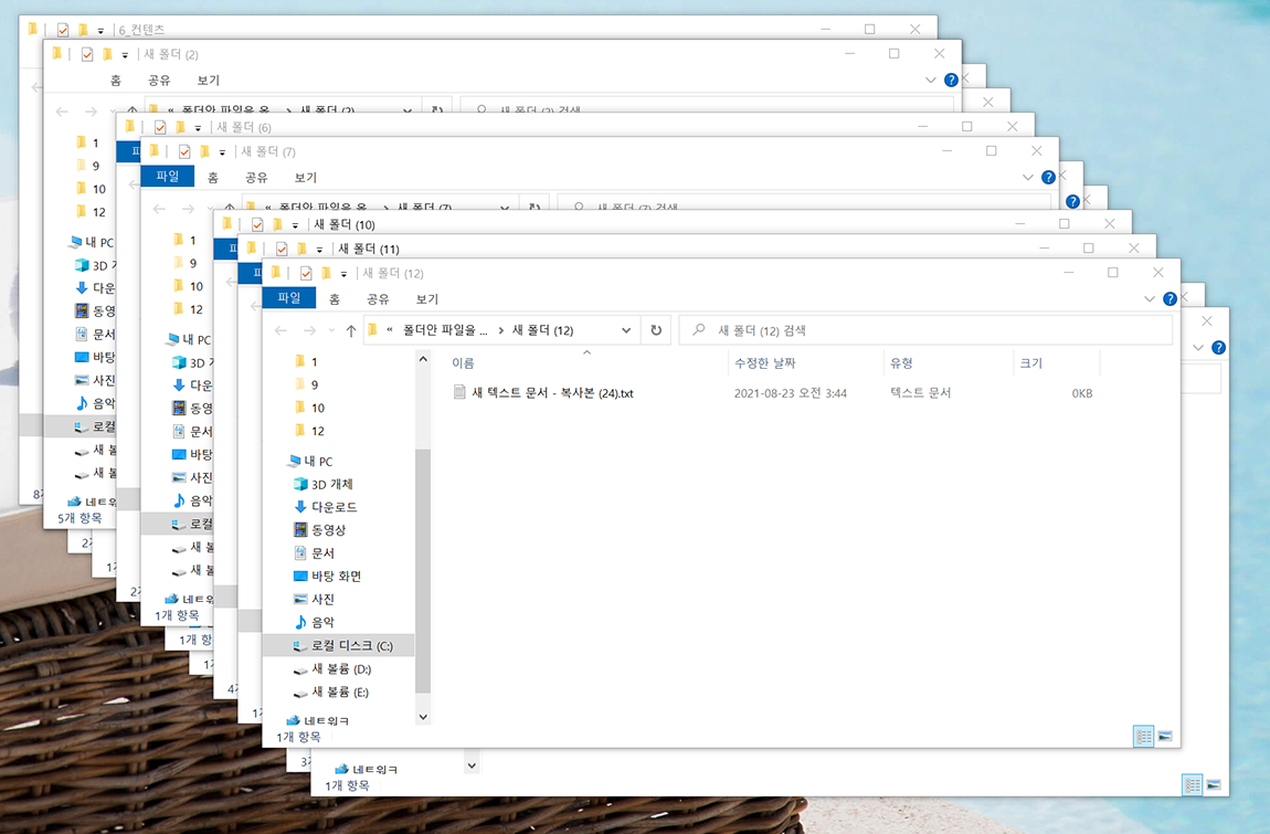 모든 폴더를 선택하고 엔터를 누르게 되면 아래 이미지와 같이 여러 개의 폴더가 한 번에 열리게 됩니다. 하지만 이 방법은 폴더가 열리는 개수의 제한도 있고 결국 폴더 하나씩 들어가 파일을 꺼내와야 하니 영리한 방법은 아닙니다.