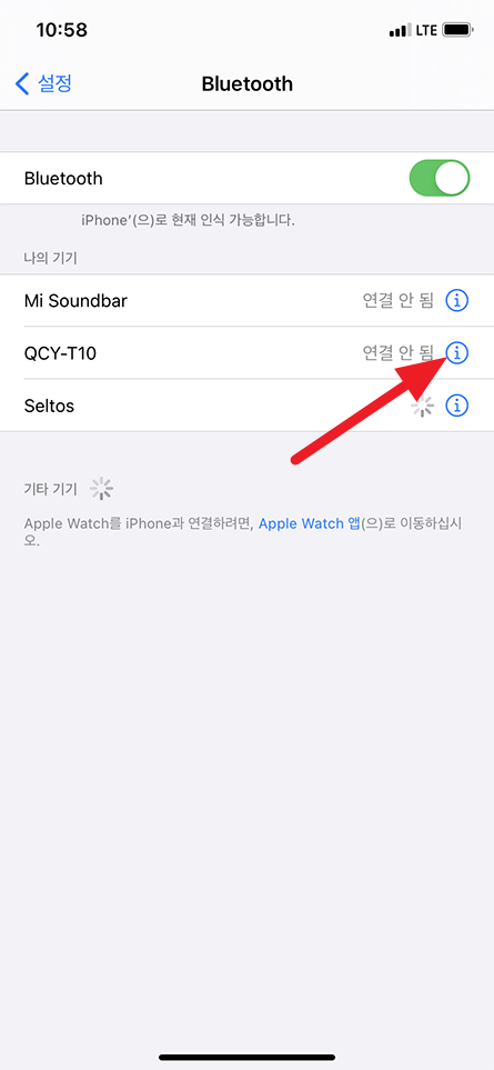 이곳에서 제가 사용하는 블루투스 이어폰 기기를 삭제하려면 ⓘ 버튼 선택.