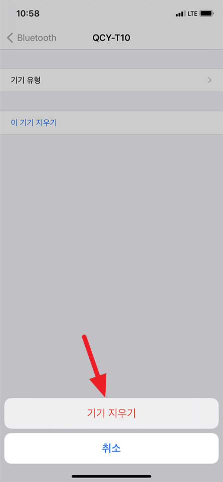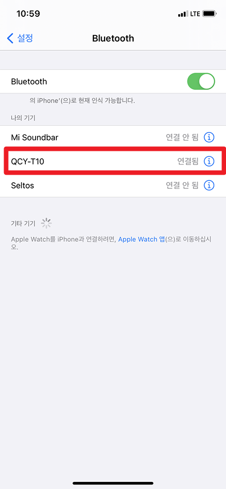 이곳에서 제가 사용하는 블루투스 이어폰 기기를 삭제하려면 ⓘ 버튼 선택.