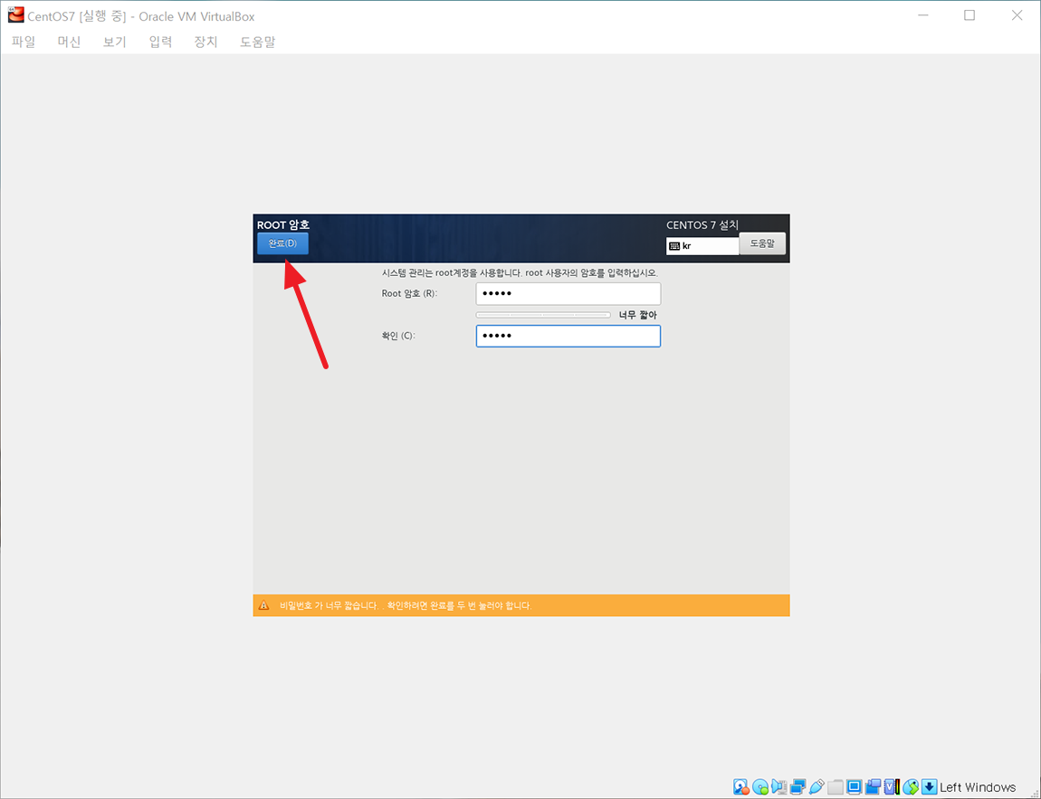 ROOT 암호 및 확인에 모두 입력 후 완료 버튼을 누르고 반응이 없다면 다시 완료 버튼을 누르시면 됩니다.