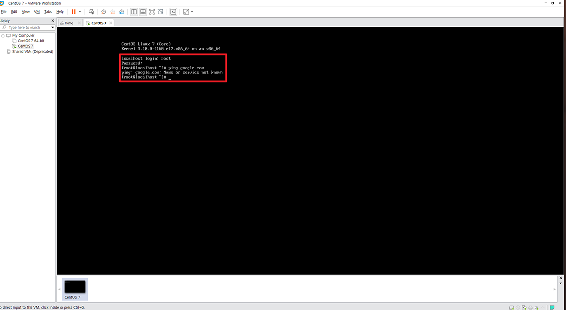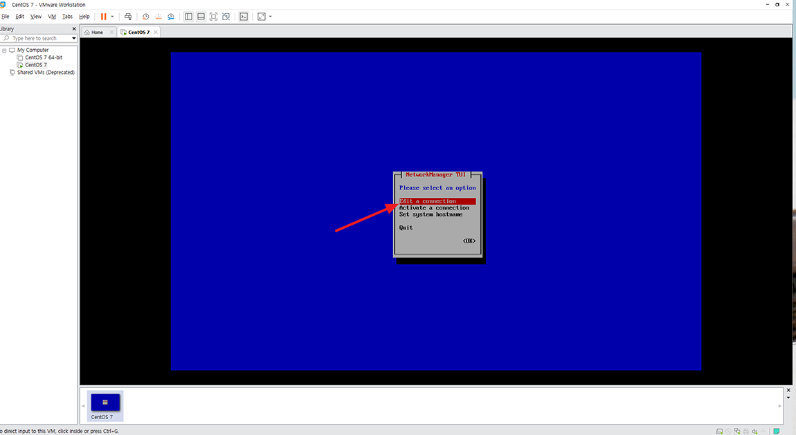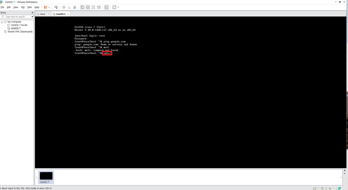 최초 설치 후 인터넷이 되는지 확인해 보았는데 인터넷이 안됩니다. 명령어 nmtui를 통해 네트워크를 설정해 주시면 됩니다.