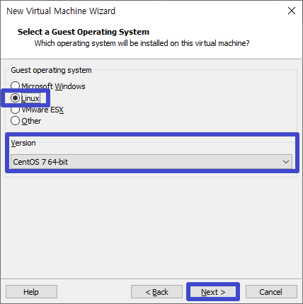 Linux 선택 후 Version CentOS 7 64-bit 선택 후 Next