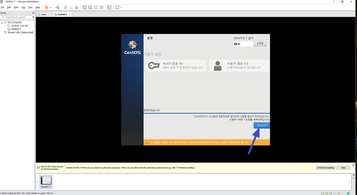 사용자 생성은 설치 이후에 쉽게 추가 가능하니 ROOT 암호만 설정하면 됩니다. 설치가 모두 끝나게 되면 아래 이미지와 같이 재부팅 선택.