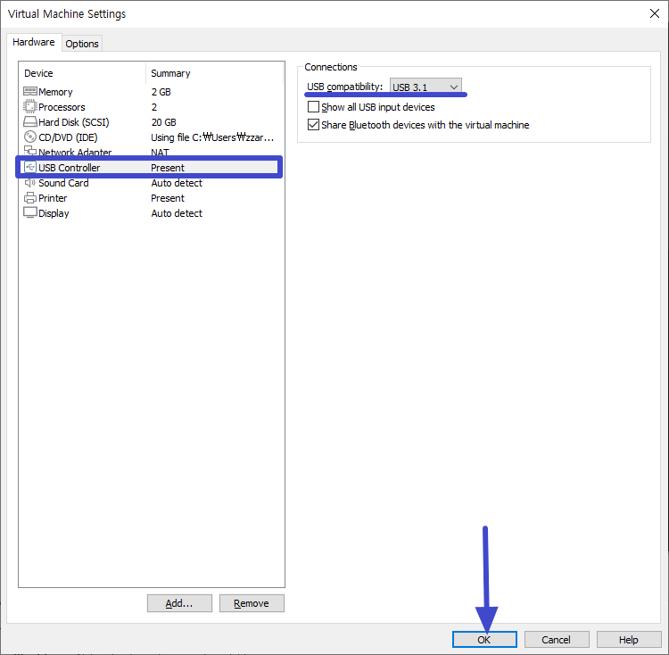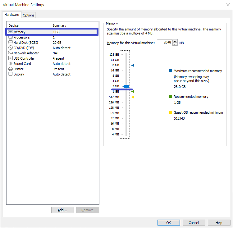 어쨌든 위 과정을 통해 설정 창이 나오게 되며 먼저 Memory 2GB 변경후 OK.