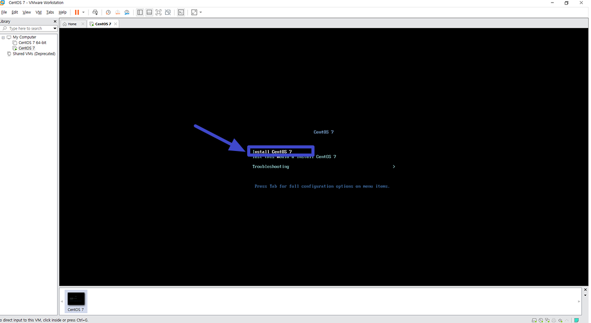 가상머신 전원이 켜지며 CentOS를 설치하기 위한 화면이 표시됩니다. 키보드 방향 키를 이용해 Install CentOS 7 선택 후 엔터.