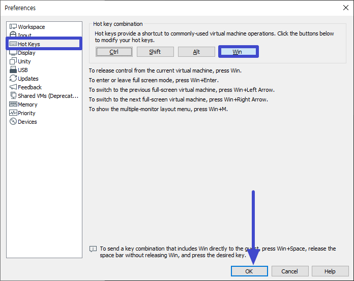 개인적으로 Hot Keys 메뉴에서 저는 Win 버튼만 활성화하고 OK를 선택하였습니다. VMware 프로그램을 빠져나가기 위해서 키보드에서 윈도우키만 누르면 되니 외우지 않아도 되니 사용하기 편합니다.