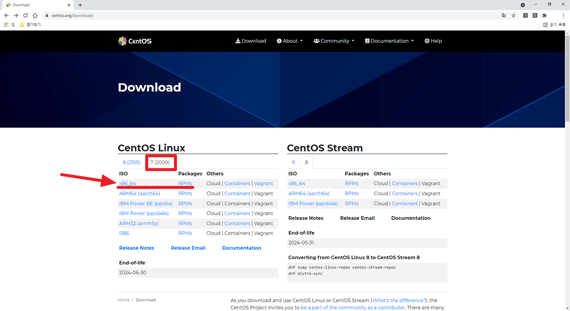 탭 메뉴에서7(2009) 선택 하시고 x86_64 메뉴 선택.