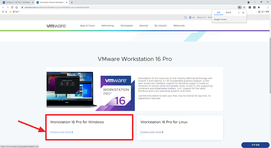 웹 페이지 중간쯤 Workstation 16 Pro for Windows 버튼을 누르시면 다운로드가 시작됩니다. 웹페이지에서 VMware Workstation 16 Pro 설치 파일을 못 찾으셨거나 정상적으로 다운로드 되지 않으신 분은 아래 URL을 통해 설치 파일을 다운로드하실 수 있으니 참고하시면 좋을 듯합니다. - https://www.vmware.com/go/getworkstation-win